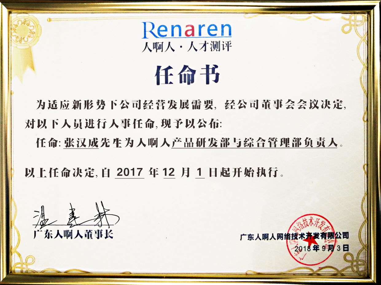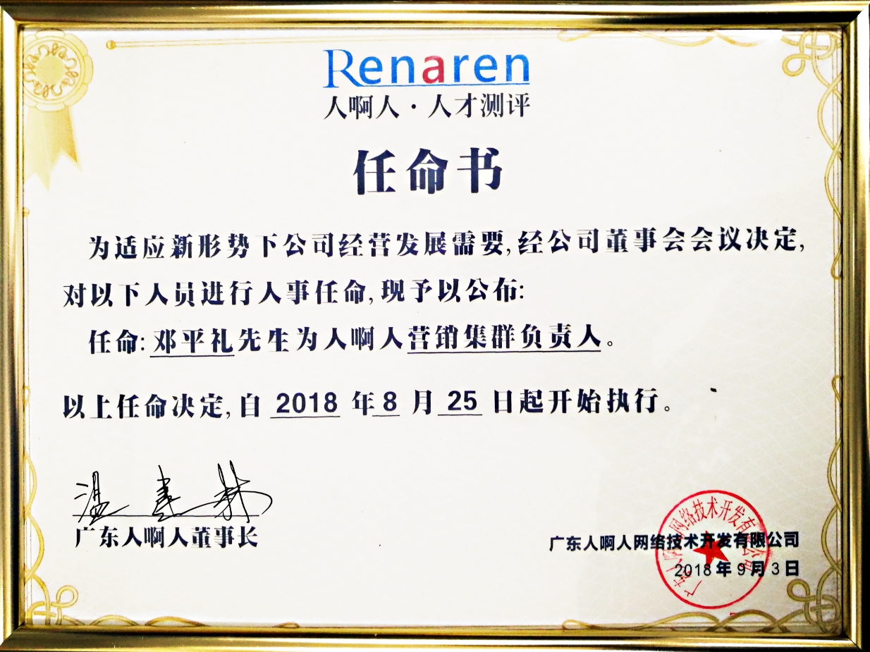 2018年9月3日,广东人啊人任命书颁发仪式在广东人啊人东莞总部办公室隆重举行。广东人啊人董事长温建林先生现场颁发任命书。