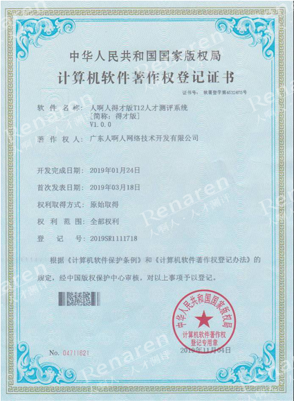 近日,人啊人传来佳讯,再获国家计算机软件著作权证书。公司旗下产品人啊人得才版T12人才测评系统成功通过了中国版权保护中心审核,并颁发相应证书。